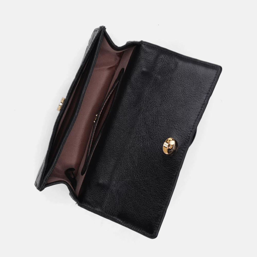 A peça de festa que também funciona no dia: baguete matelassê com corrente dupla dourada e aba longa slim. O perfil alongado deixa o visual atual e elegante, enquanto o apoio de ombro em couro garante conforto. Perfeita para elevar jeans + blazer ou acompanhar vestidos.